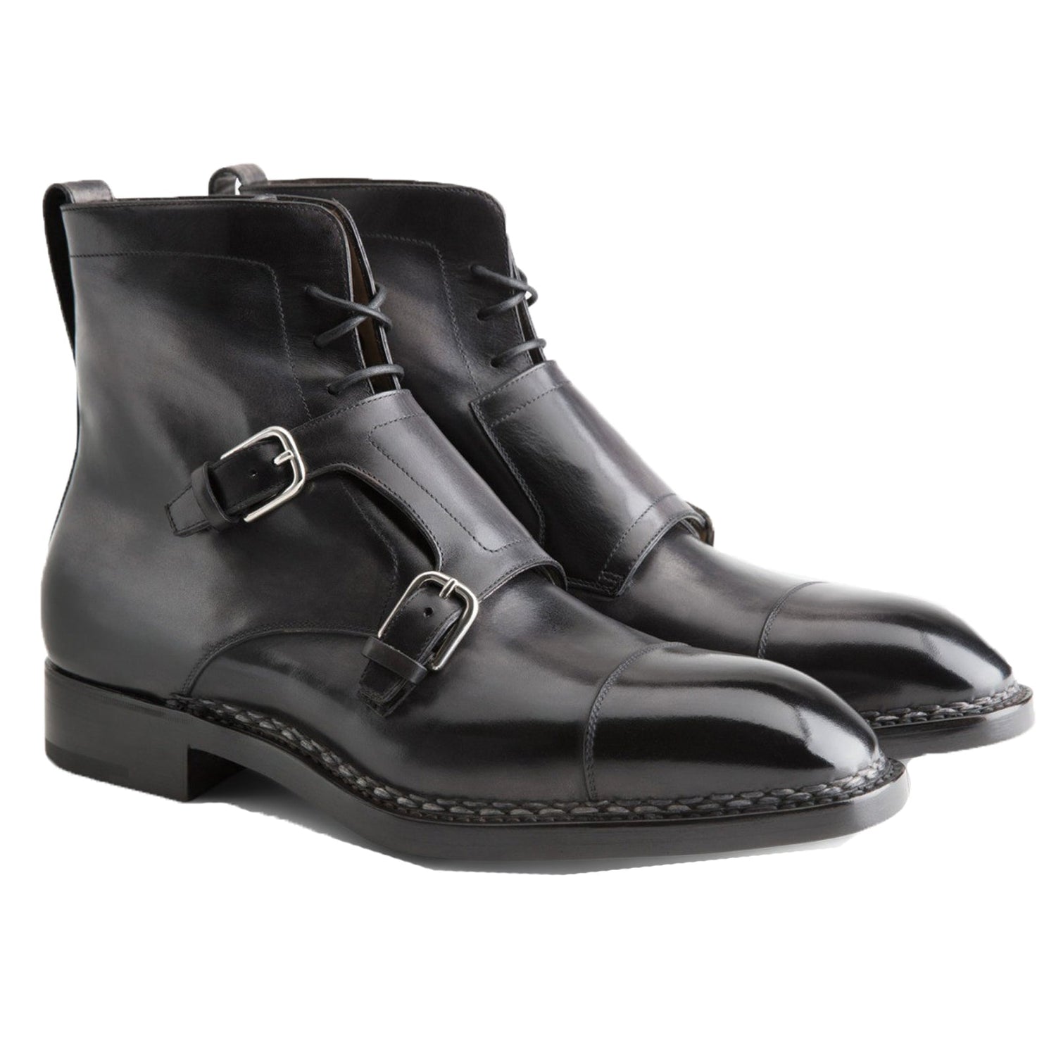 Height Increasing Norwegian Welted Mafra Black Leather Double Monk Strap Oxford Boot